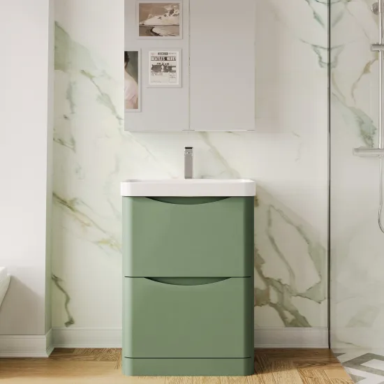 nuie Lunar Floor Standing 2 Drawer Unit & Thin Edge Ceramic Basin, 600mm - Satin Green