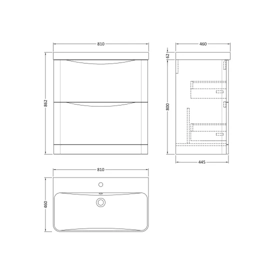 nuie Lunar Floor Standing 2 Drawer Unit & Thin Edge Ceramic Basin, 800mm - Satin Grey