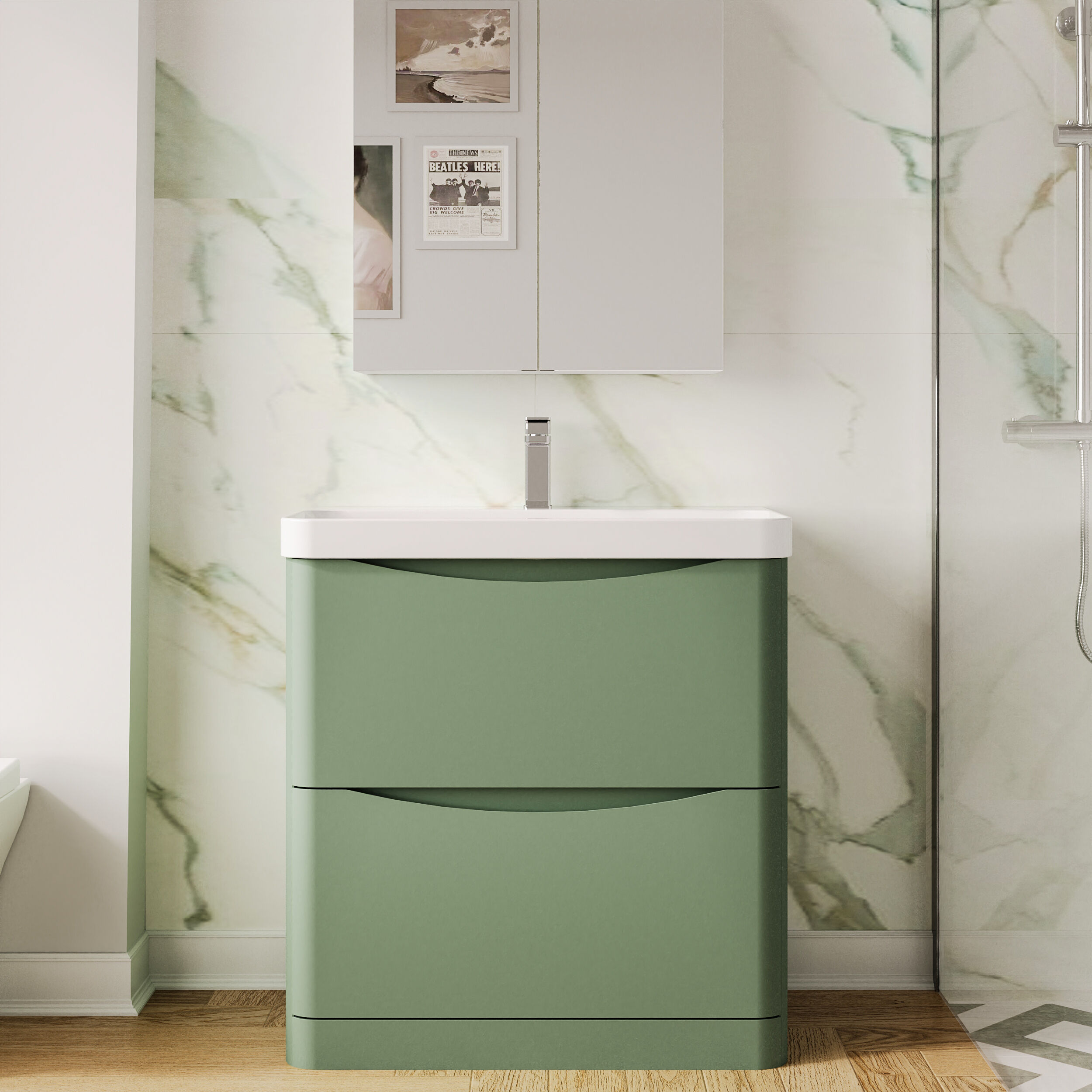 Nuie Lunar 800mm Satin Green Floor Standing 2 Drawer Vanity Unit With Ceramic Basin
