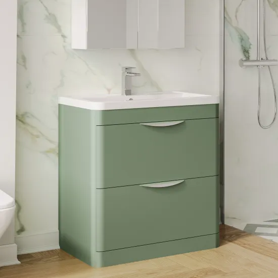 Nuie 800mm Satin Green 2 Drawer Soft Close Floor Standing Vanity Unit with Polymarble Basin