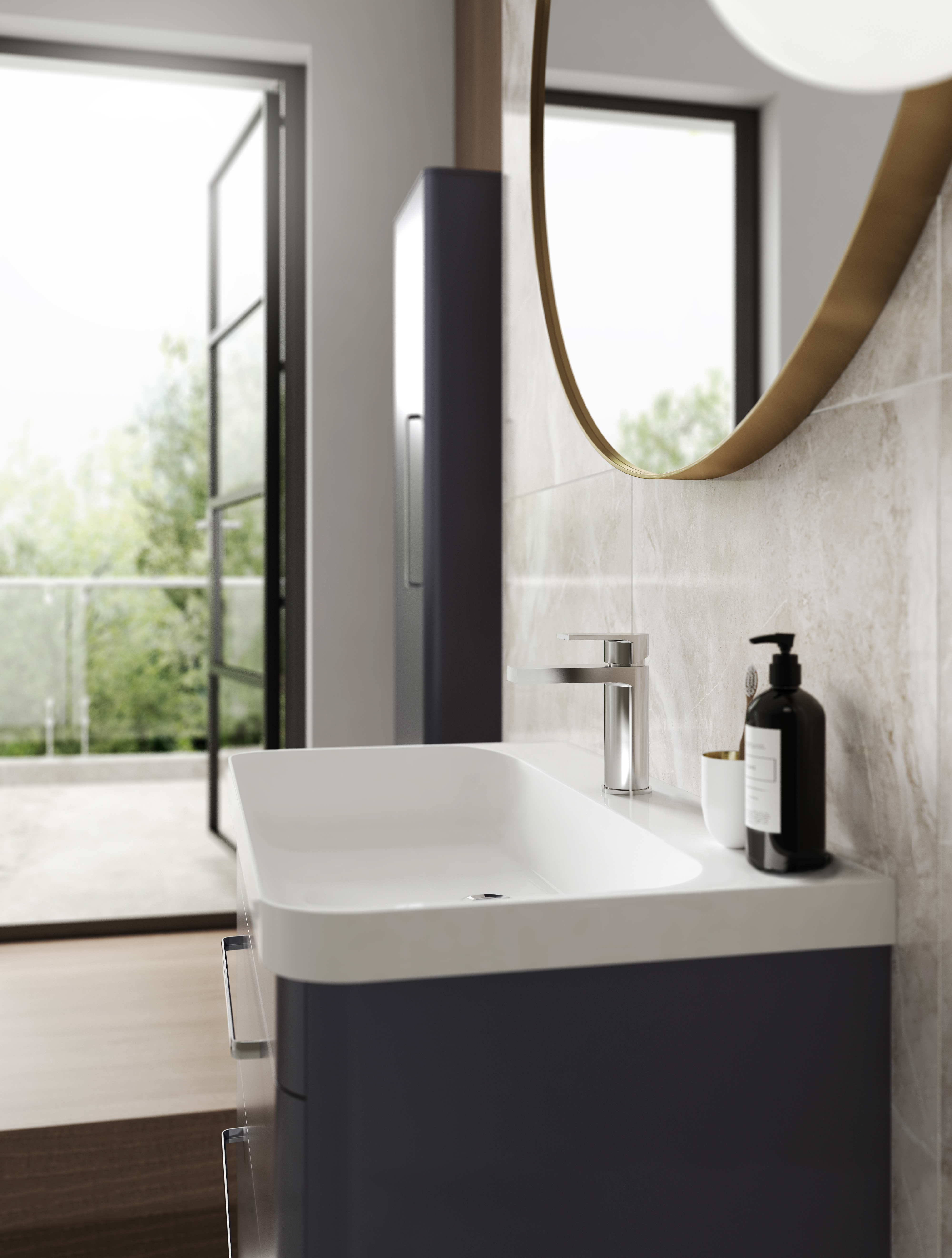 This floor-standing unit gives ample storage, perfect for a busy family bathroom
