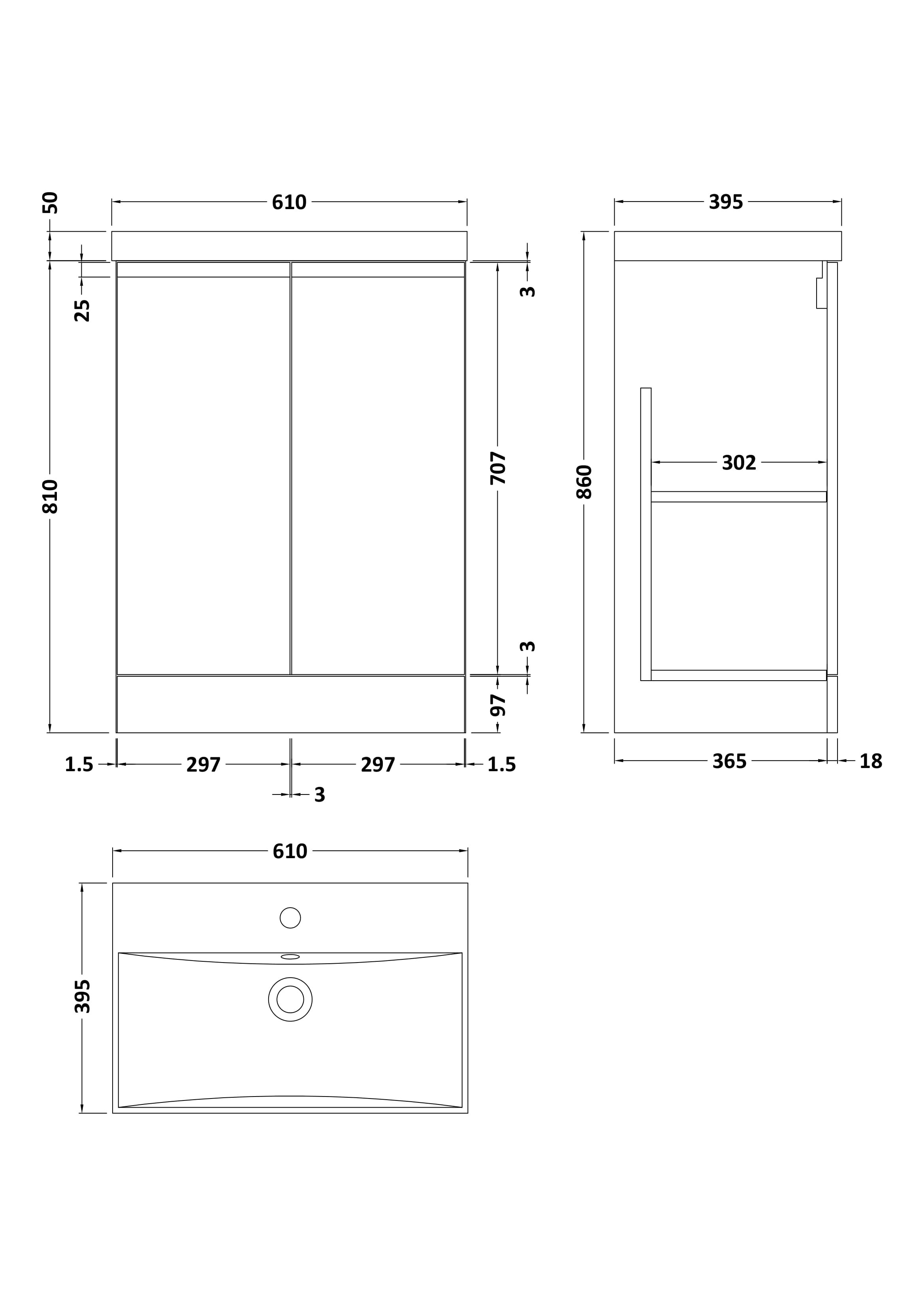 Hudson Reed Urban 600mm Floor Standing 2 Door 1 Drawer Vanity Unit With Thin-Edge Ceramic Basin, Soft Close