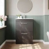 Nuie Athena 600mm Gloss Grey Floor Standing 2 Drawer Vanity Unit with 1 Tap Hole Basin