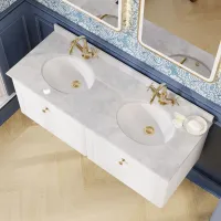 Nuie Classique 1220mm Satin White Wall Hung 2 Drawer Vanity Unit with 2 Tap Hole Round Basin