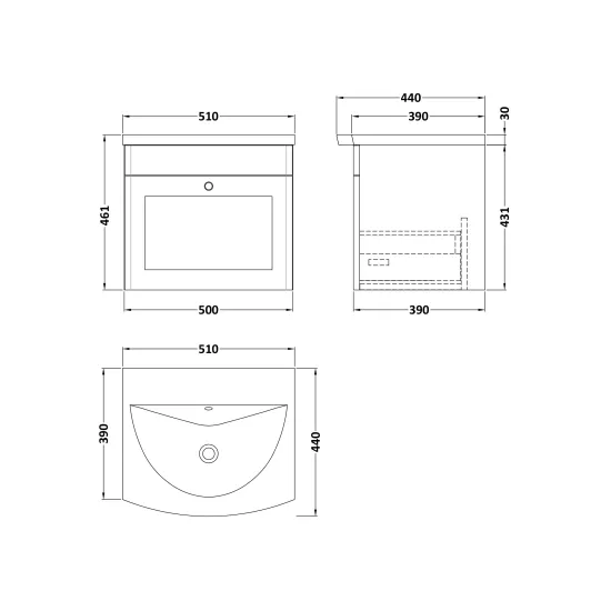 Nuie Classique 500mm Wall Hung 1 Drawer Unit & Curved Basin with Soft Close Drawers