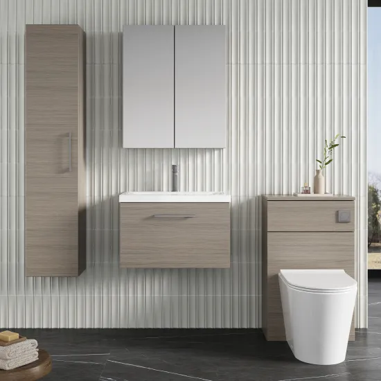 This unique solace oak finish compliments any modern bathroom and creates a designer look