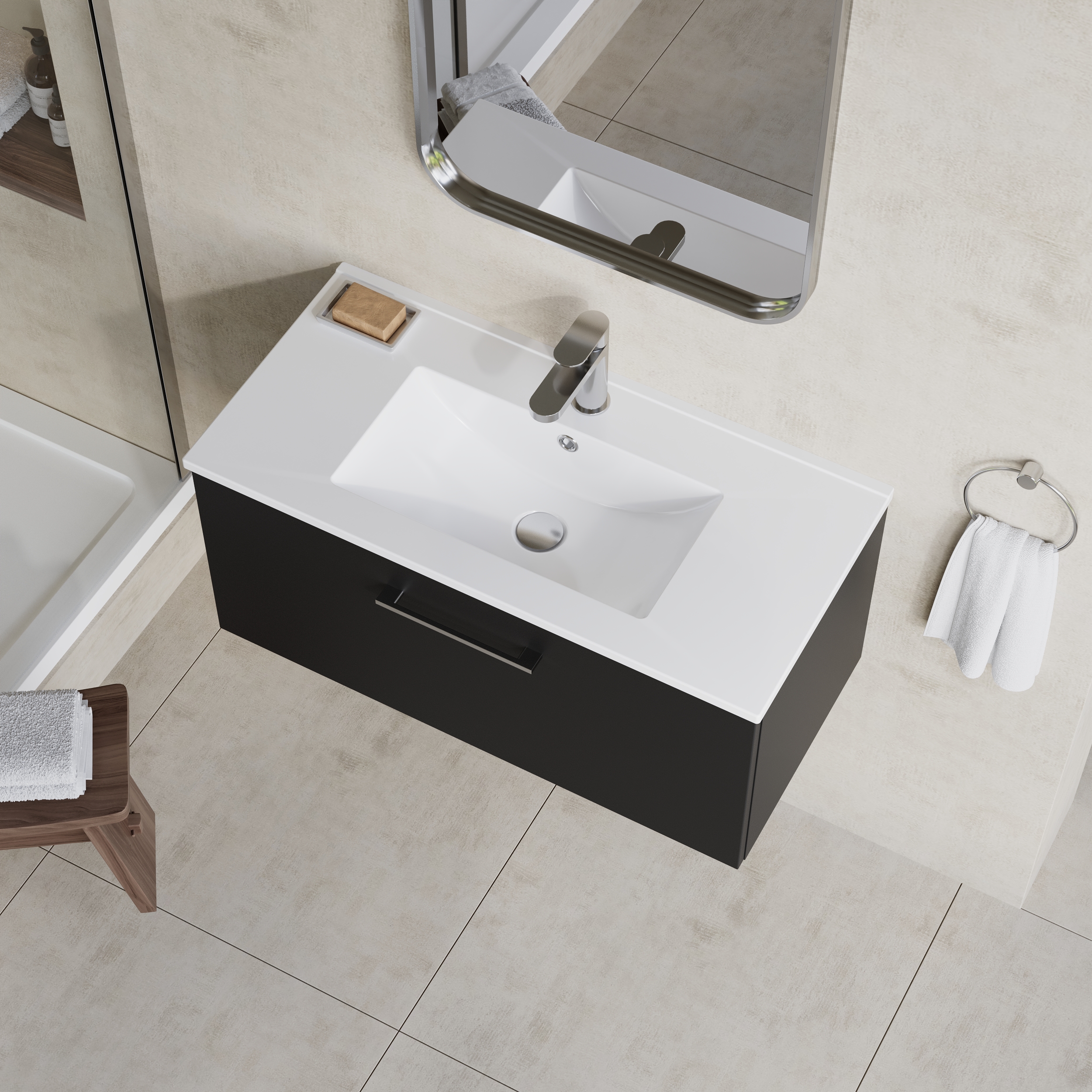 nuie Arno Wall Hung 1 Drawer Vanity & Minimalist Ceramic Basin, 800mm - Soft Black