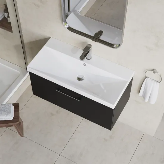 nuie Arno Wall Hung 1 Drawer Vanity & Thin-Edge Ceramic Basin, 800mm - Soft Black