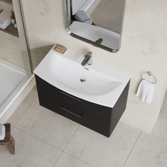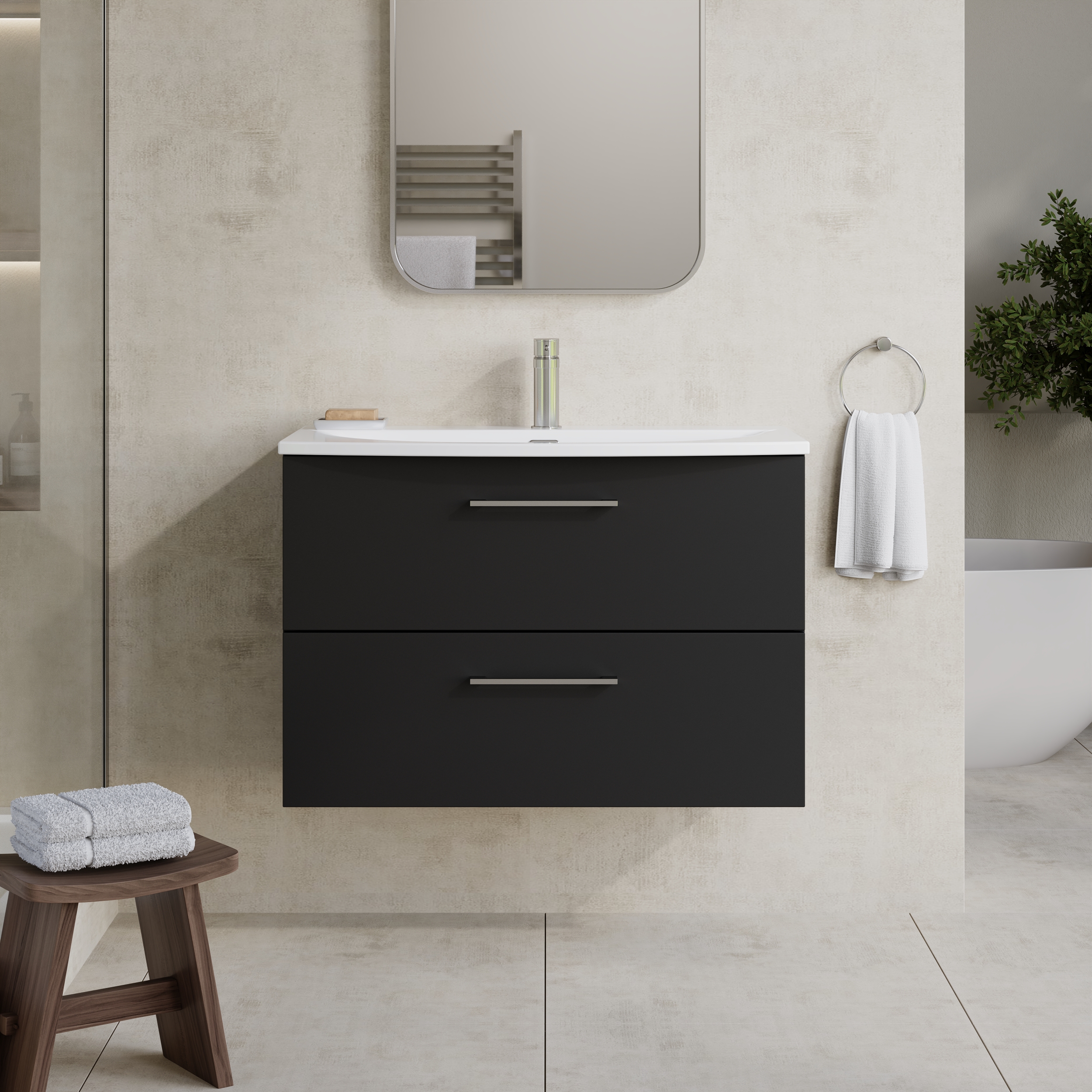 nuie Arno Wall Hung 2 Drawer Vanity & Curved Ceramic Basin, 800mm - Soft Black
