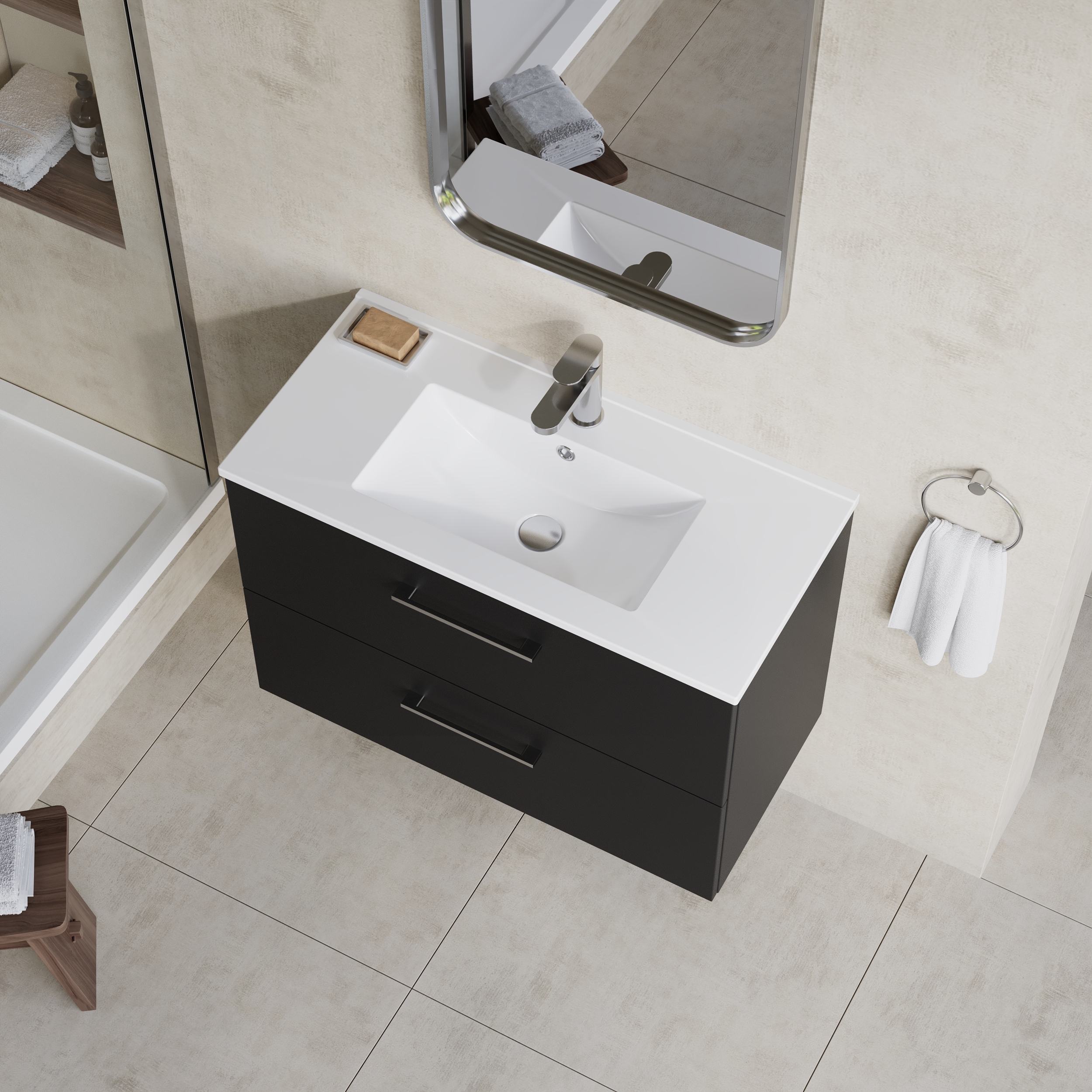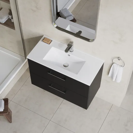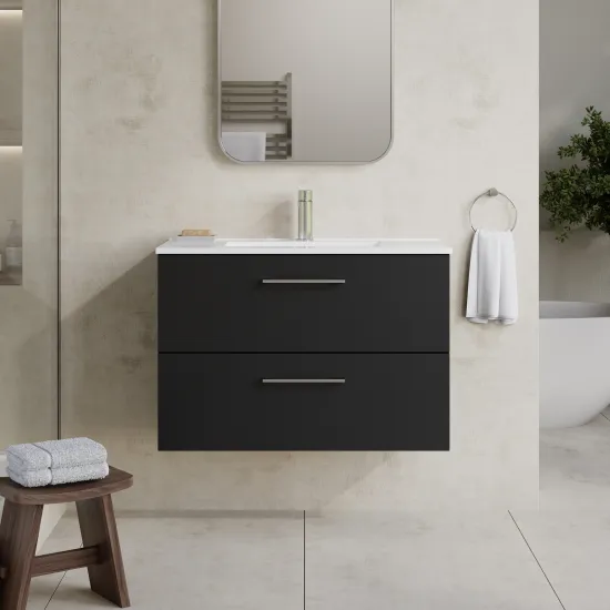 nuie Arno Wall Hung 2 Drawer Vanity & Minimalist Ceramic Basin, 800mm - Soft Black