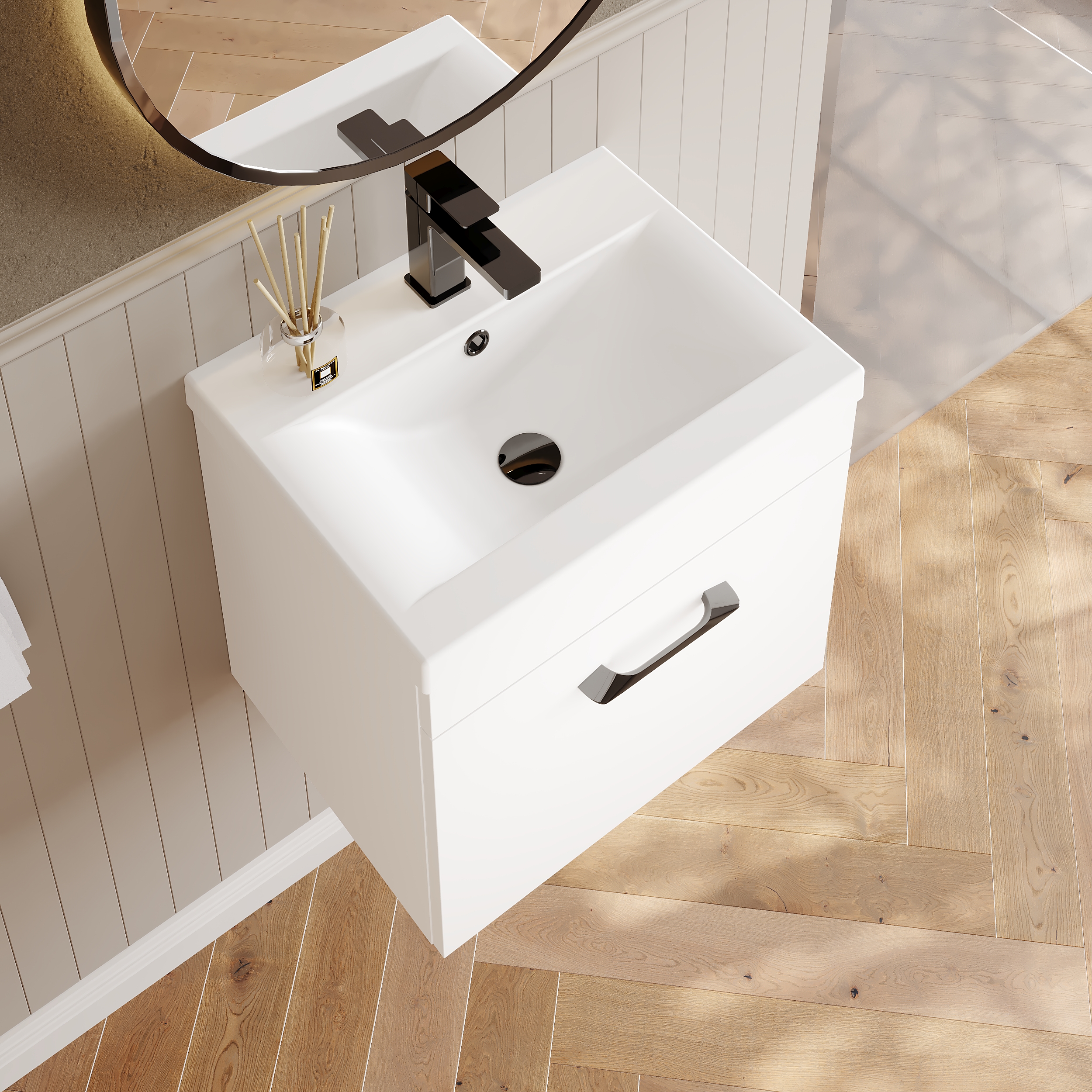 nuie Athena Wall Hung 1 Drawer Vanity with Ceramic Mid-Edge Basin and Handle 500mm - Gloss White/Matt Black