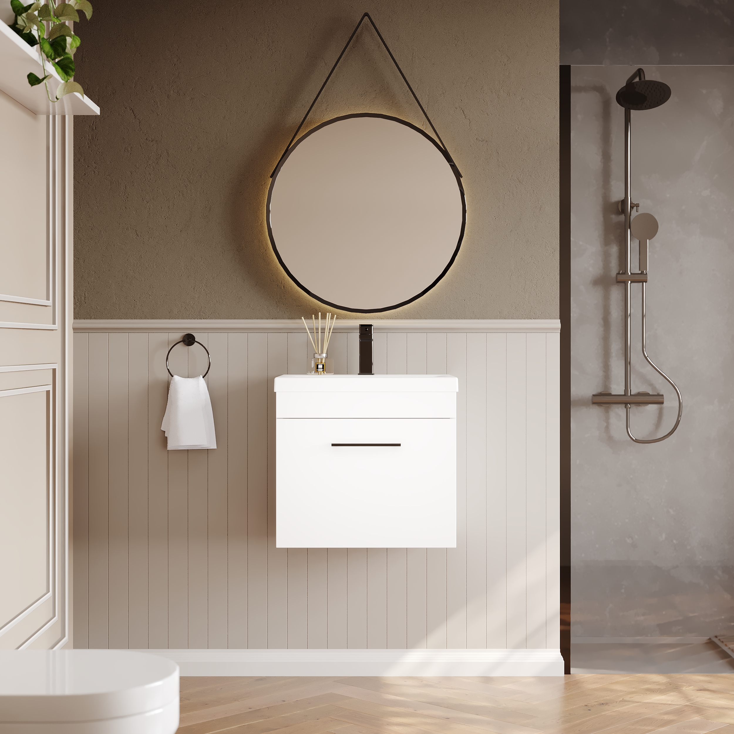 nuie Athena Wall Hung 1 Drawer Vanity with Ceramic Mid-Edge Basin and Handle 500mm - Gloss White/Matt Black