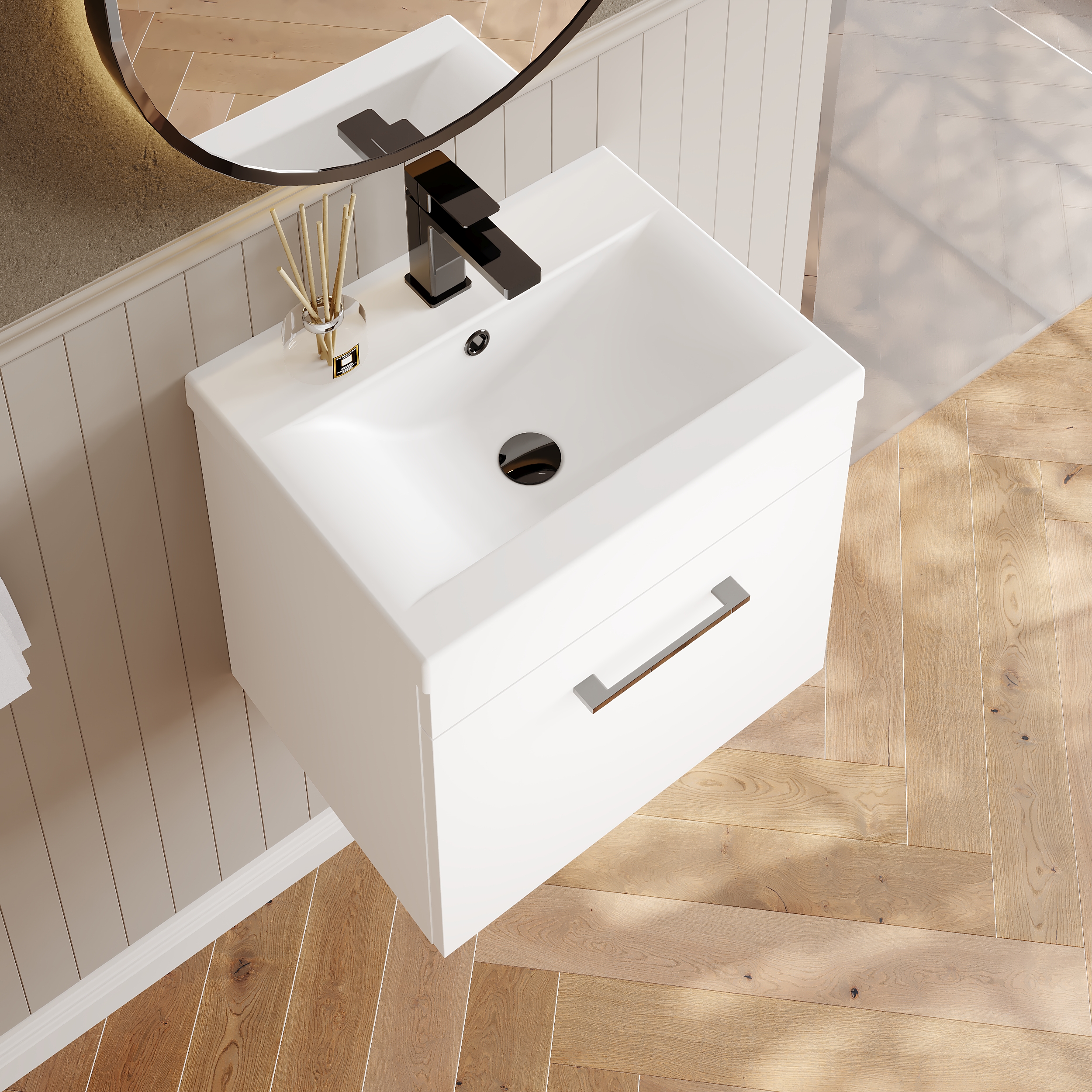 Nuie Athena 500mm Wall Hung 1 Drawer Vanity Unit with Ceramic Basin and Handle