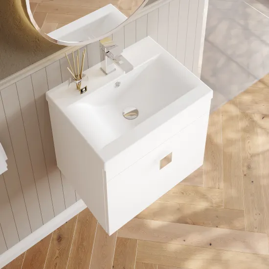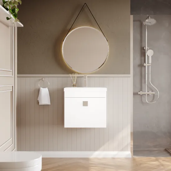 This sleek gloss white finish compliments any modern bathroom to create a designer look