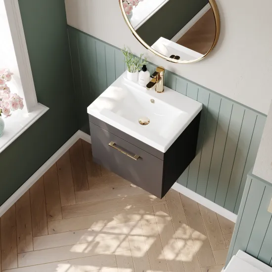 nuie Athena Wall Hung 1 Drawer Vanity with Ceramic Mid-Edge Basin and Handle 500mm - Gloss Grey/Brushed Brass