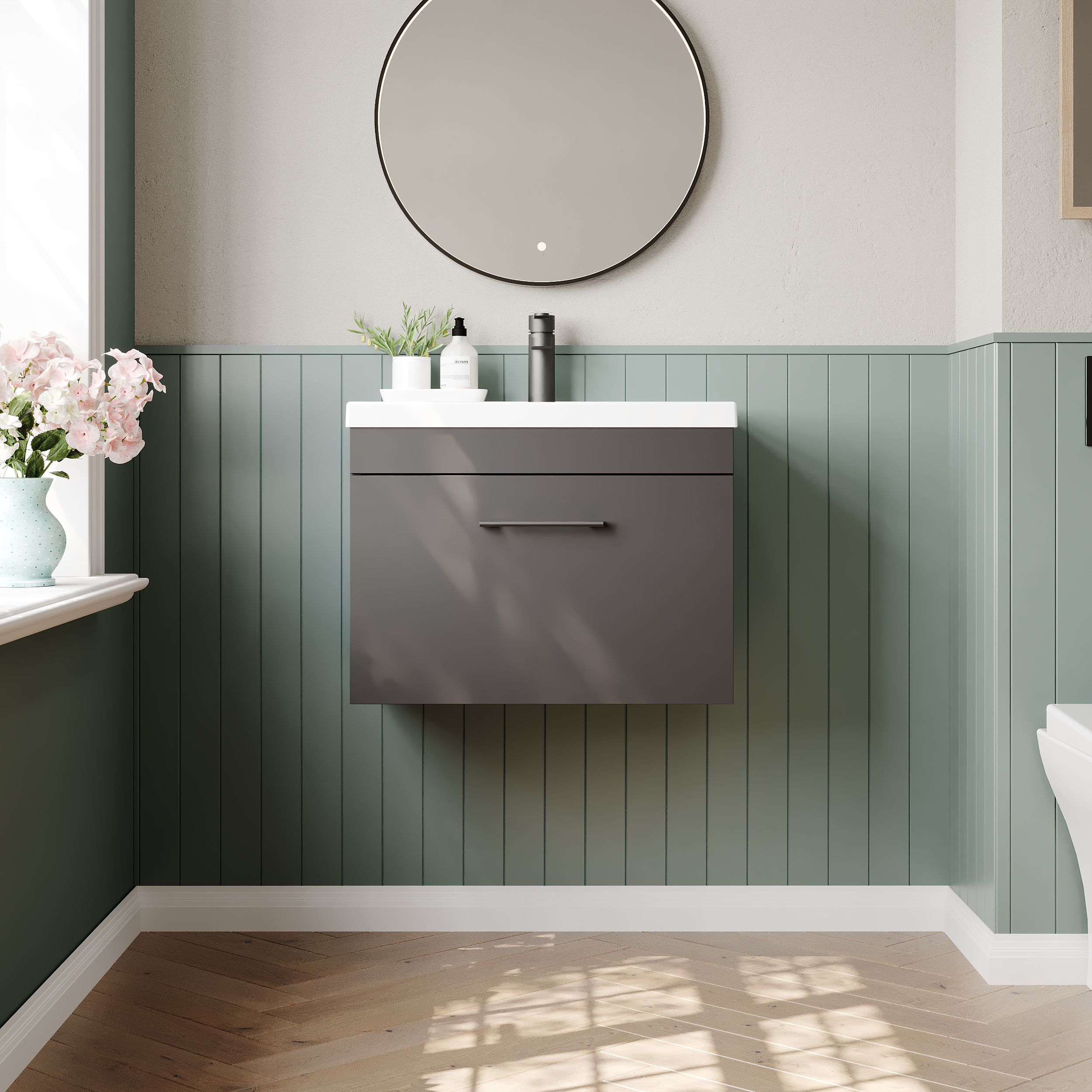 nuie Athena Wall Hung 1 Drawer Vanity with Ceramic Mid-Edge Basin and Handle 600mm - Gloss Grey/Matt Black