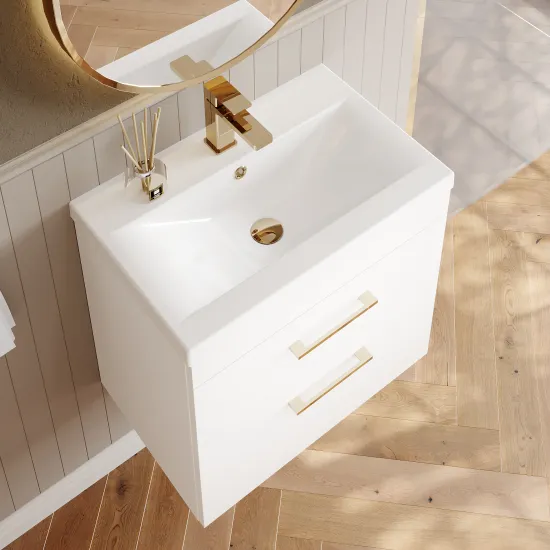 nuie Athena Wall Hung 1 Drawer Vanity with Ceramic Mid-Edge Basin and Handle 600mm - Gloss White/Brushed Brass