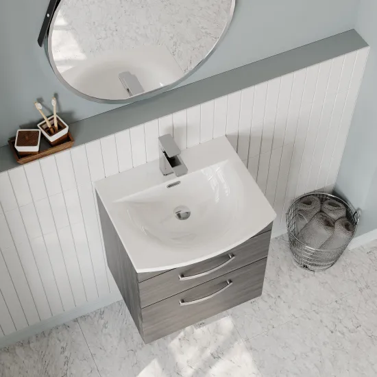 nuie Athena Wall Hung 2 Drawer Vanity With Curved 1 Tap Hole Ceramic Basin 500mm - Anthracite Woodgrain