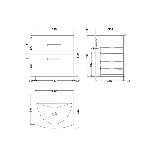 nuie Athena Wall Hung 2 Drawer Vanity With Curved 1 Tap Hole Ceramic Basin 500mm - Gloss Grey