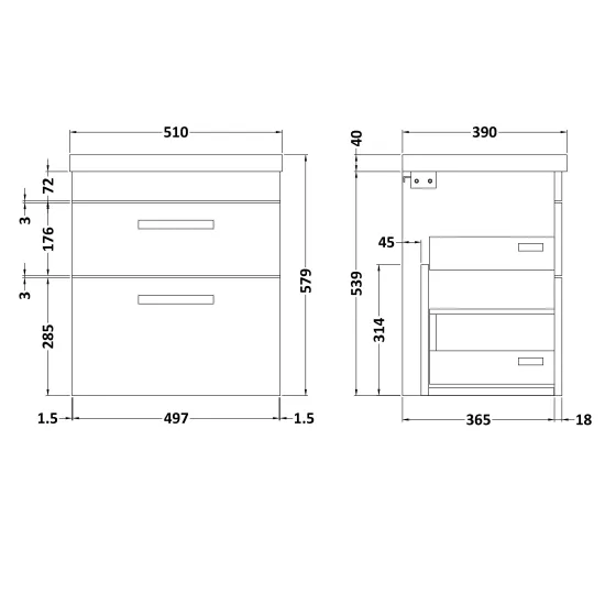 Nuie Athena 500mm Wall Hung 2 Drawer Vanity Unit With Basin