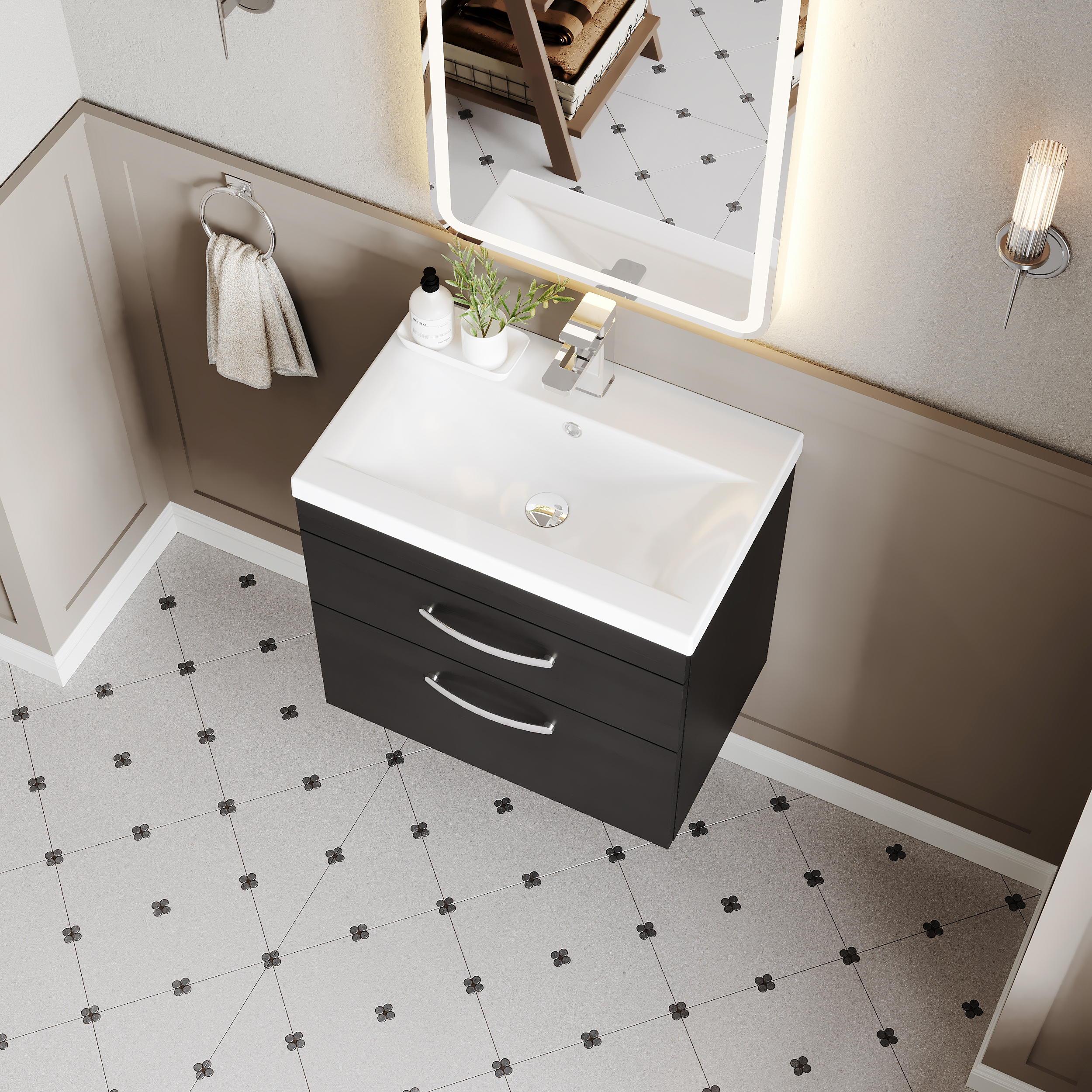 Nuie Athena 600mm Charcoal Black Wall Hung 2 Drawer Vanity Unit with Basin