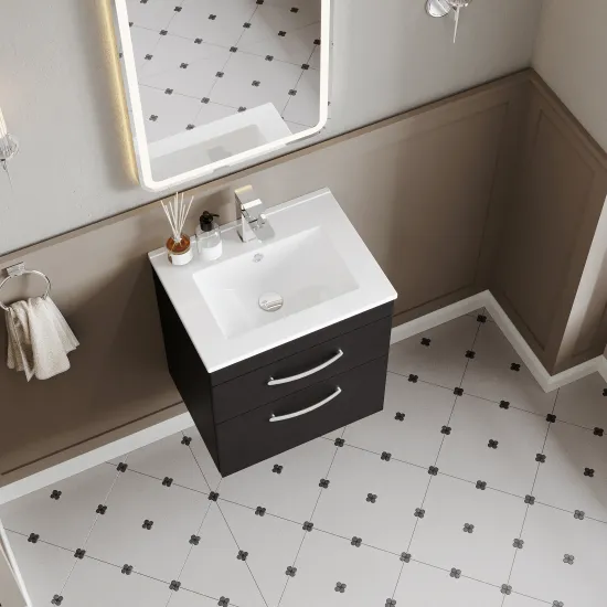 Nuie Athena 505mm Anthracite Woodgrain Wall Hung 2 Drawer Vanity Unit With 1 Tap Hole Basin