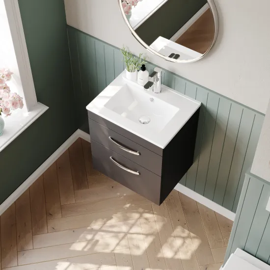 Nuie Athena 505mm Anthracite Woodgrain Wall Hung 2 Drawer Vanity Unit With 1 Tap Hole Basin