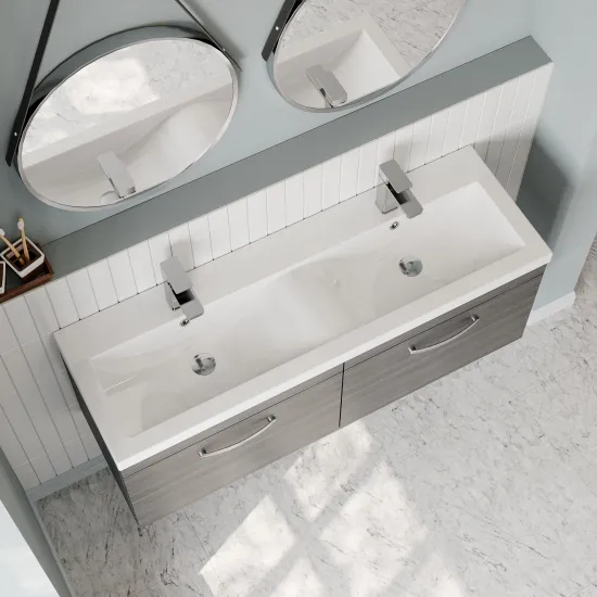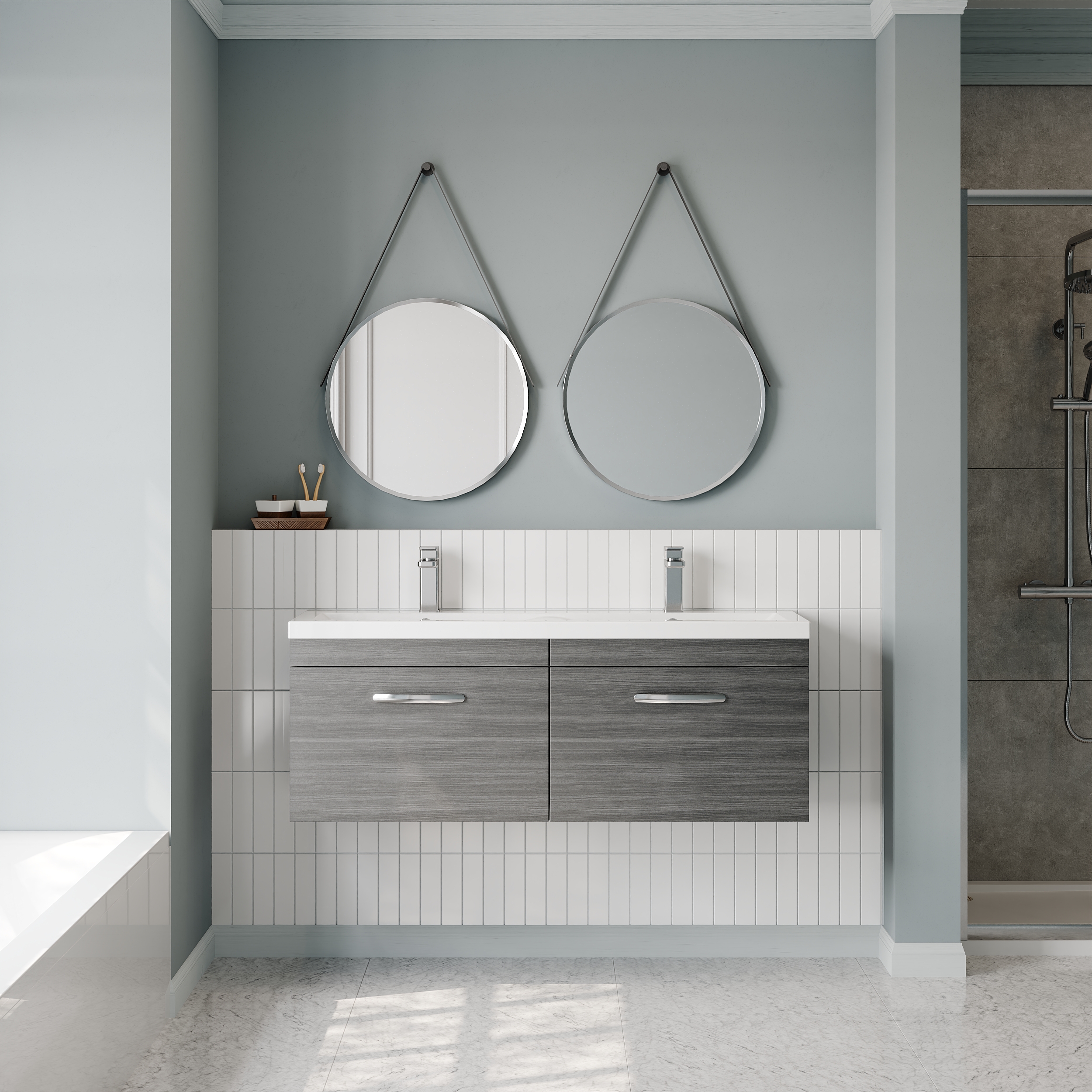 nuie Athena Wall Hung 2 Drawer Vanity With Twin Ceramic Basin 1200mm - Anthracite Woodgrain