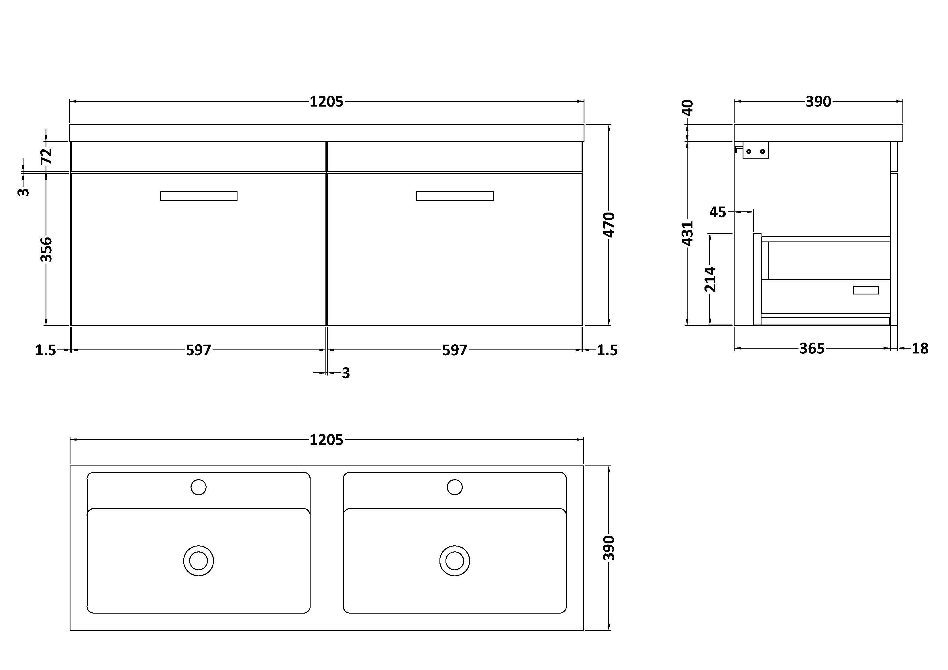 Nuie Athena 1200mm Anthracite Woodgrain Wall Hung 2 Drawer Vanity Unit With Twin Basin