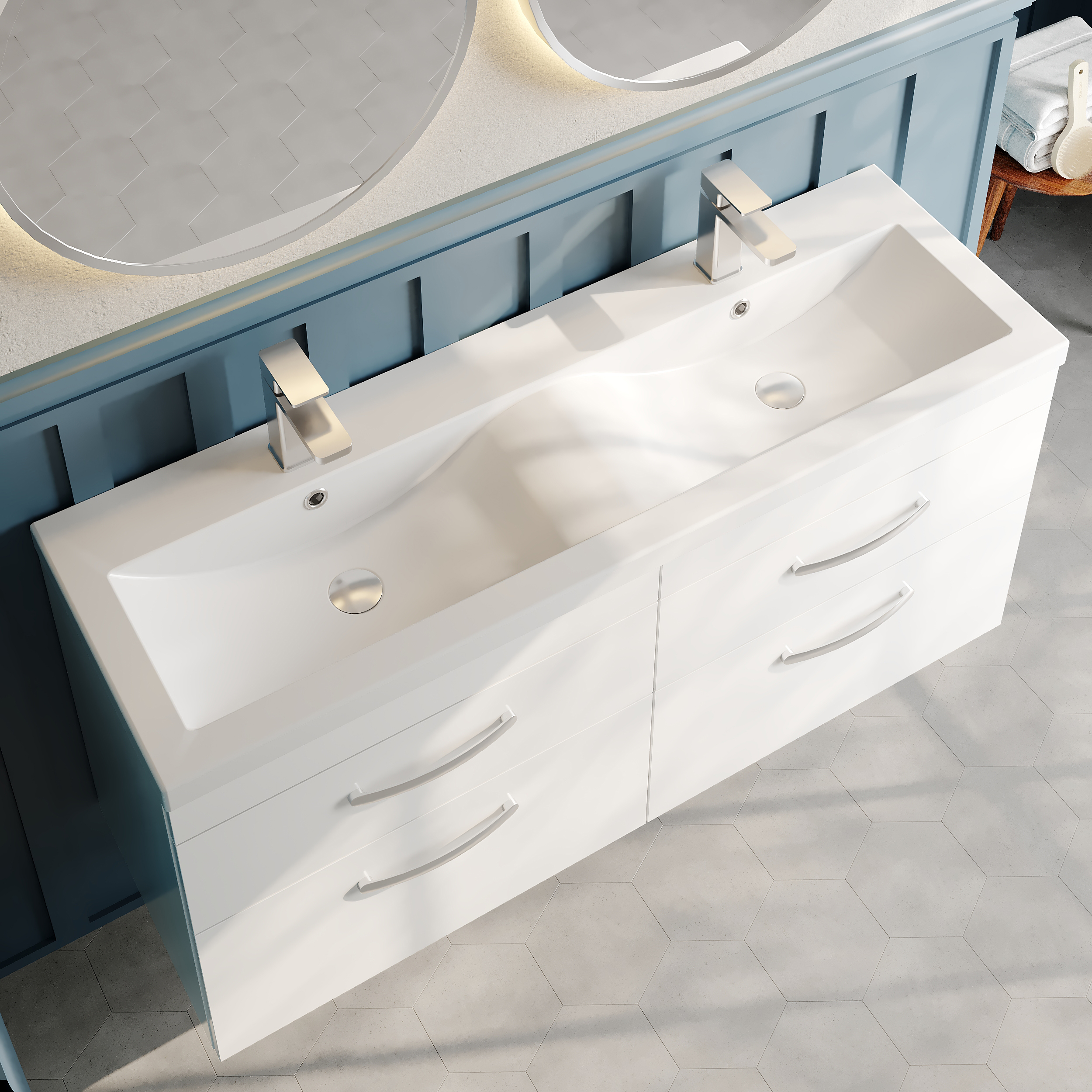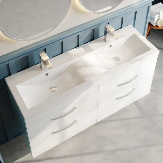 nuie Athena Wall Hung 4 Drawer Vanity With Twin Ceramic Basin 1200mm - Gloss White