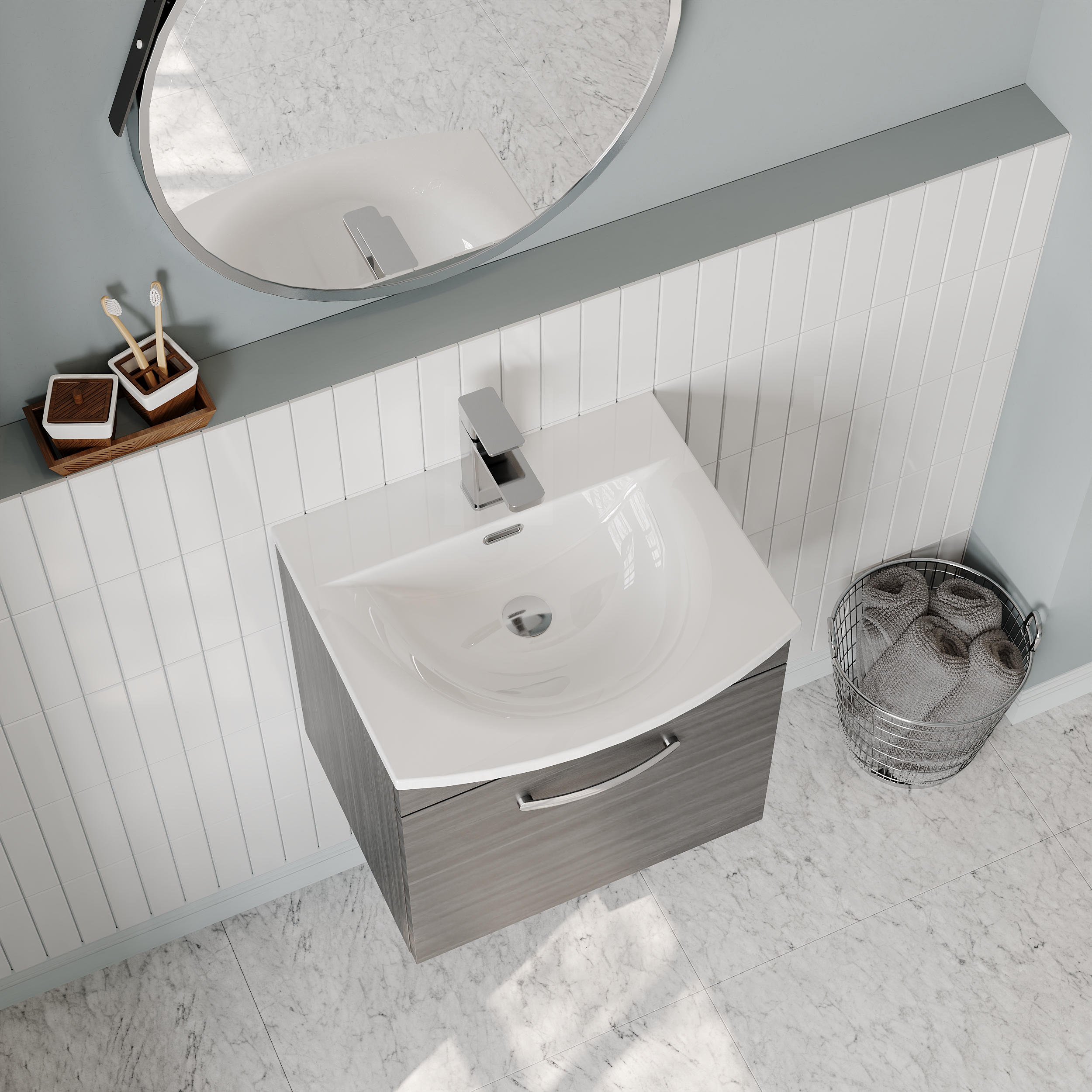 nuie Athena Wall Hung Single Drawer Vanity With Curved 1 Tap Hole Ceramic Basin 500mm - Anthracite Woodgrain