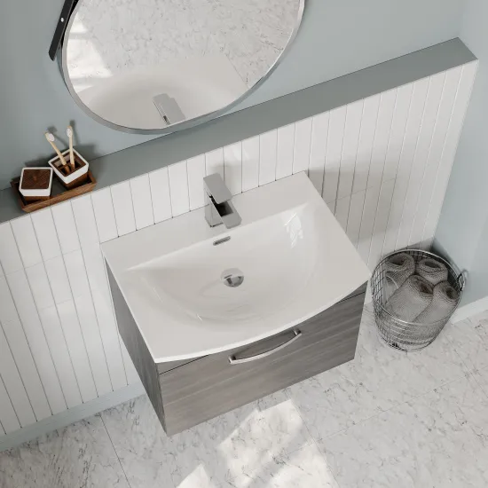 nuie Athena Wall Hung Single Drawer Vanity With Curved 1 Tap Hole Ceramic Basin 600mm - Anthracite Woodgrain