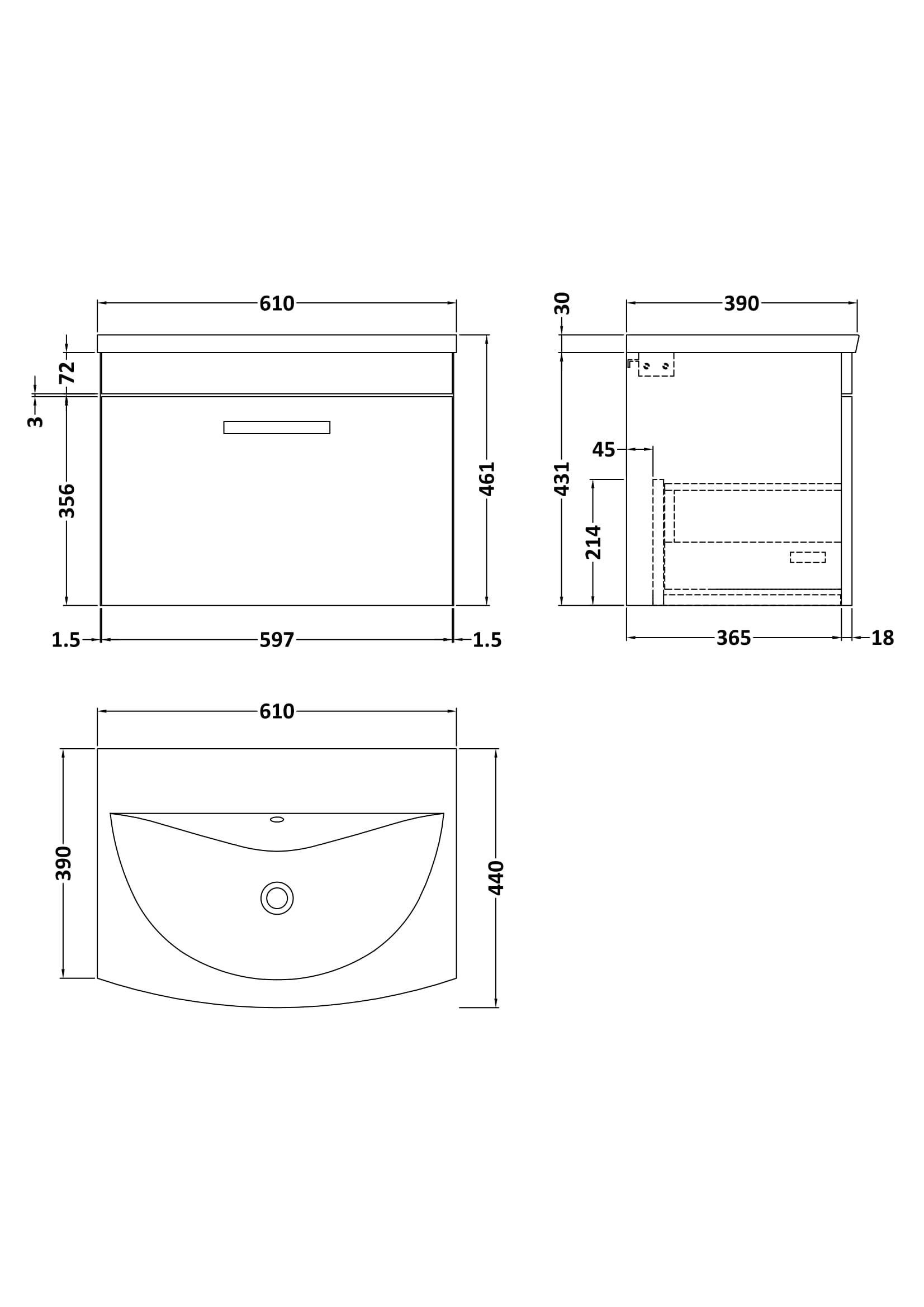 nuie Athena Wall Hung Single Drawer Vanity With Curved 1 Tap Hole Ceramic Basin 600mm - Gloss Grey