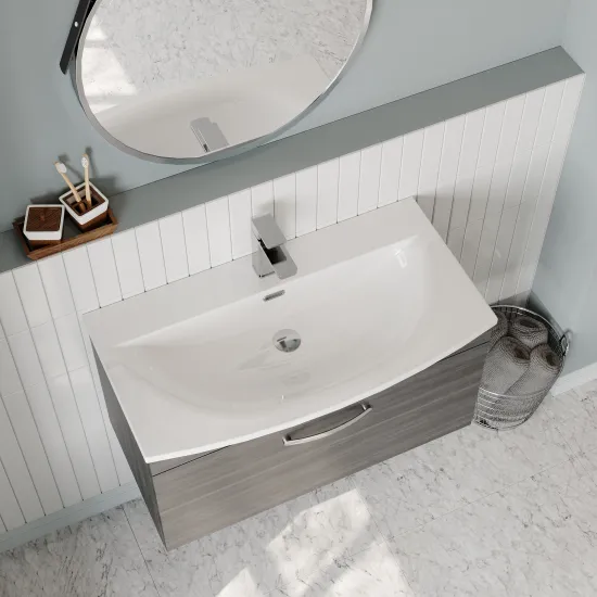 nuie Athena Wall Hung Single Drawer Vanity With Curved 1 Tap Hole Ceramic Basin 800mm - Anthracite Woodgrain
