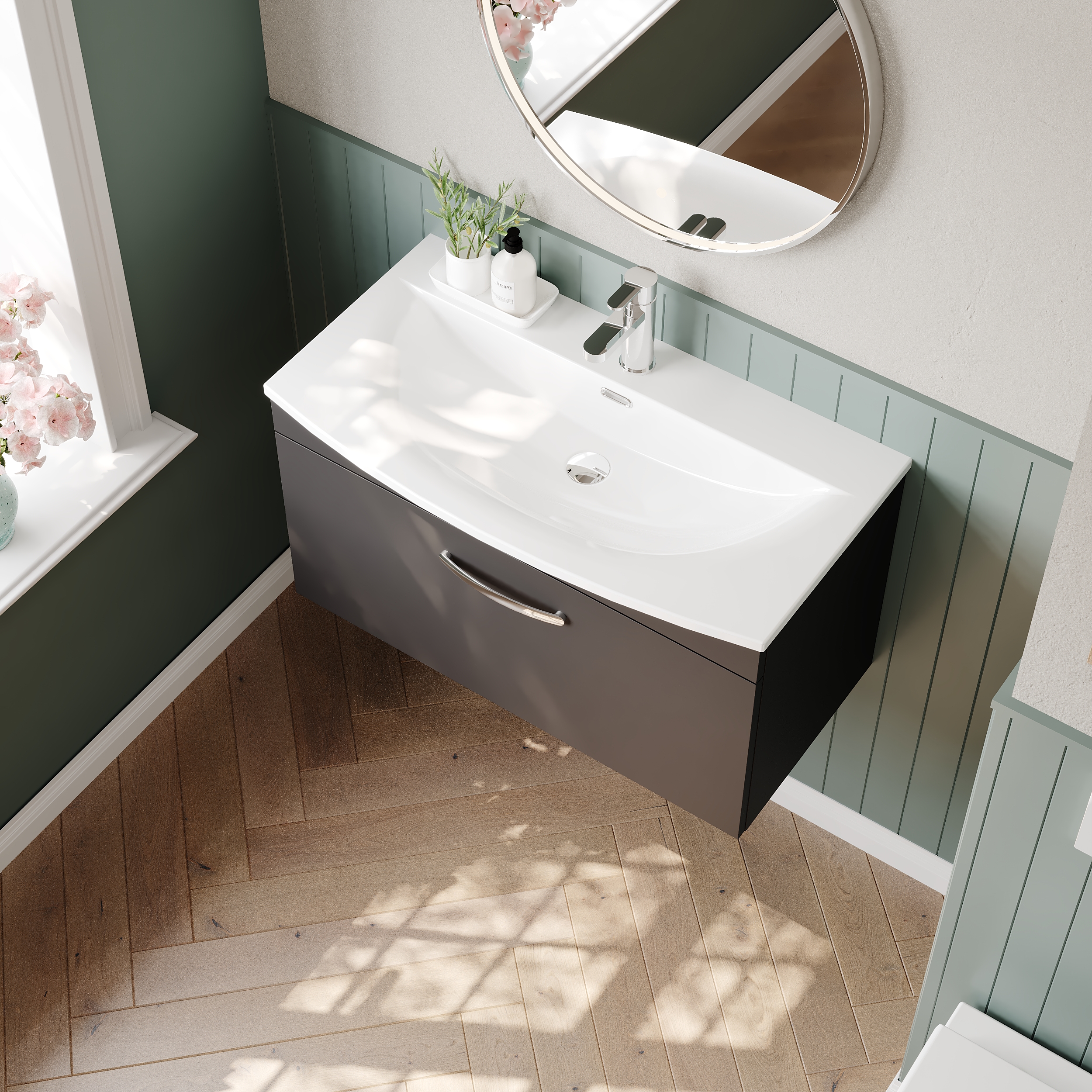 nuie Athena Wall Hung Single Drawer Vanity With Curved 1 Tap Hole Ceramic Basin 800mm - Gloss Grey