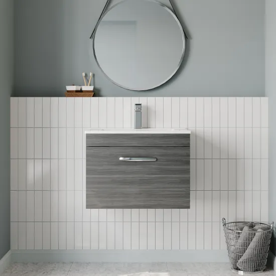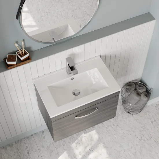 nuie Athena Wall Hung Single Drawer Vanity With Minimalist 1 Tap Hole Ceramic Basin 600mm - Anthracite Woodgrain