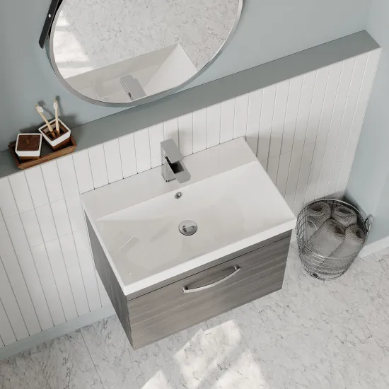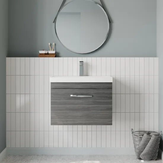 nuie Athena Wall Hung Single Drawer Vanity With Thin-Edge 1 Tap Hole Ceramic Basin 600mm - Anthracite Woodgrain