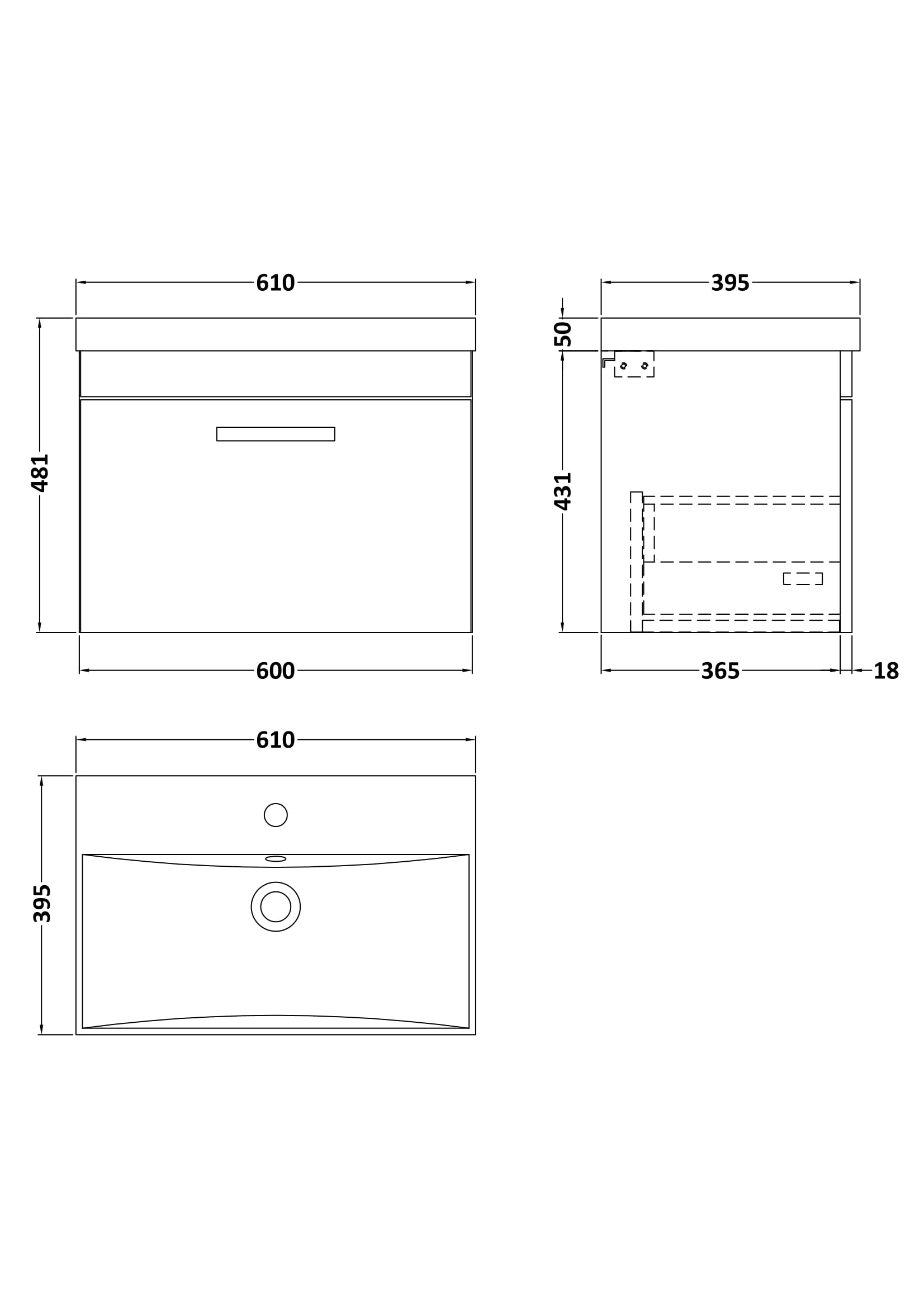 Nuie Athena 600mm Charcoal Black Wall Hung Single Drawer Vanity Unit with Thin-Edge 1 Tap Hole Basin