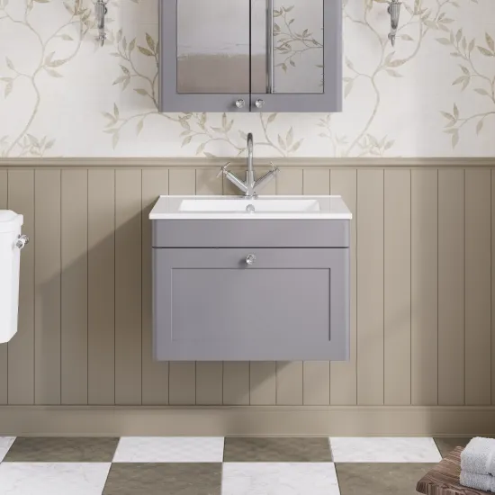 nuie Classique 600mm Wall Hung 1-Drawer Vanity with Basin - 1 Tap Hole - Satin Grey