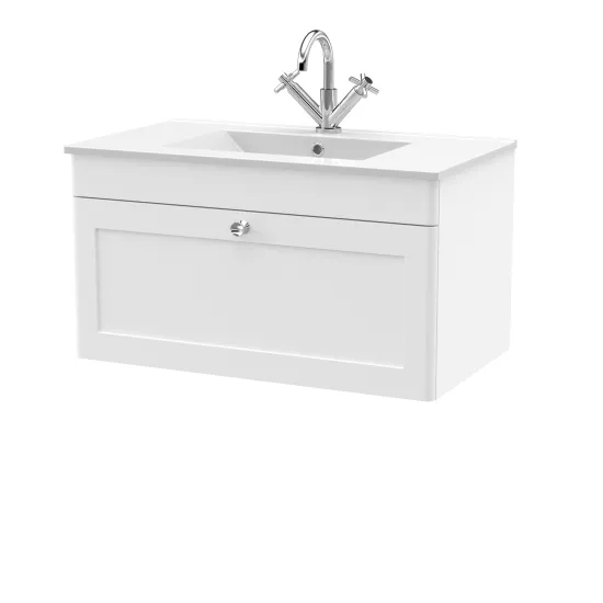 nuie Classique 800mm Wall Hung Single Drawer Vanity with Basin - 1 Tap Hole - Satin White