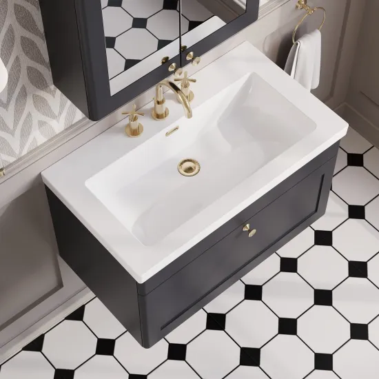 Nuie Classique 800mm Soft Black Wall Hung Single Drawer Vanity with 3 Tap Hole Basin With Chrome Handle