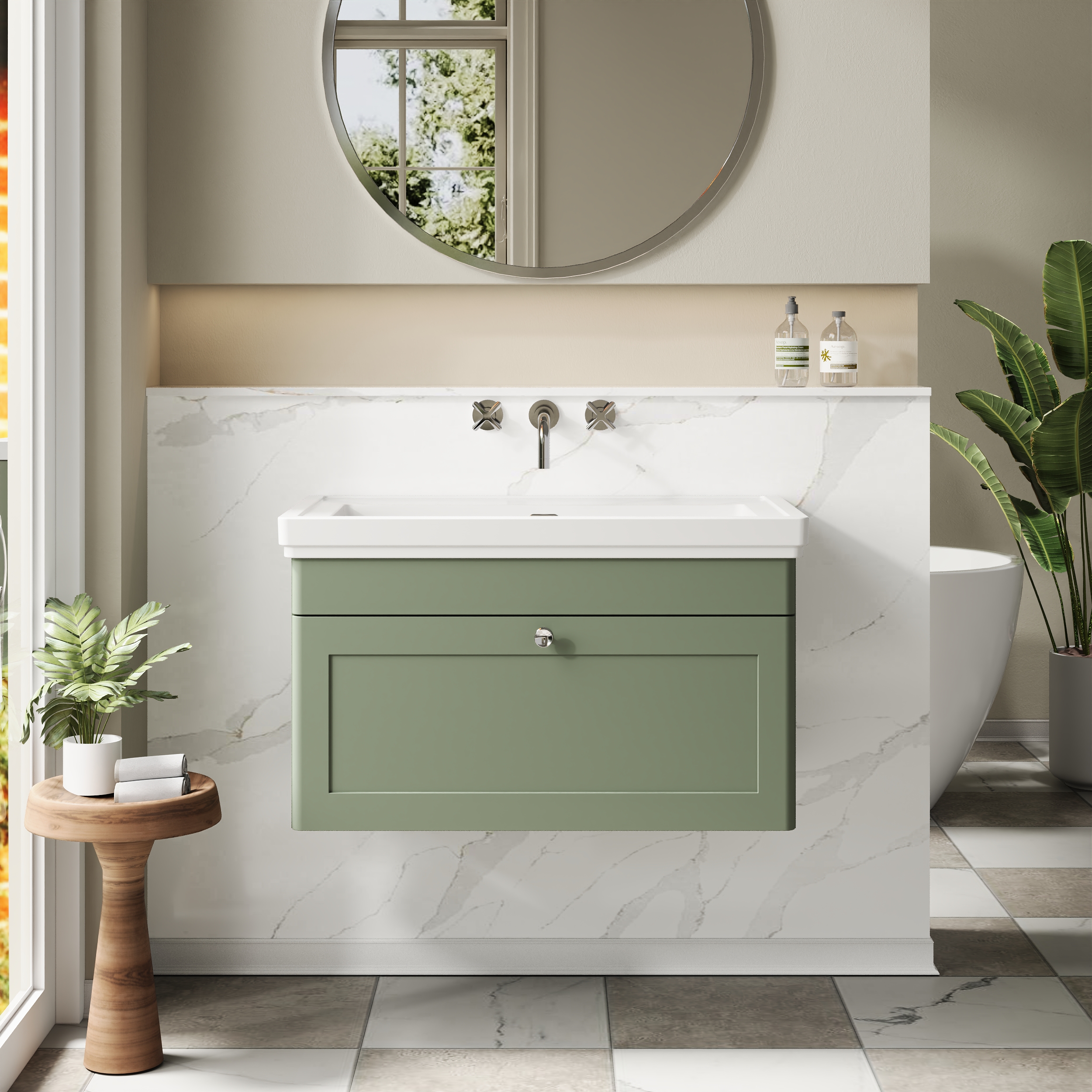 Nuie Classique 800mm Satin Green Wall Hung 1 Drawer Vanity Basin Unit Including 1 Tap Hole Basin