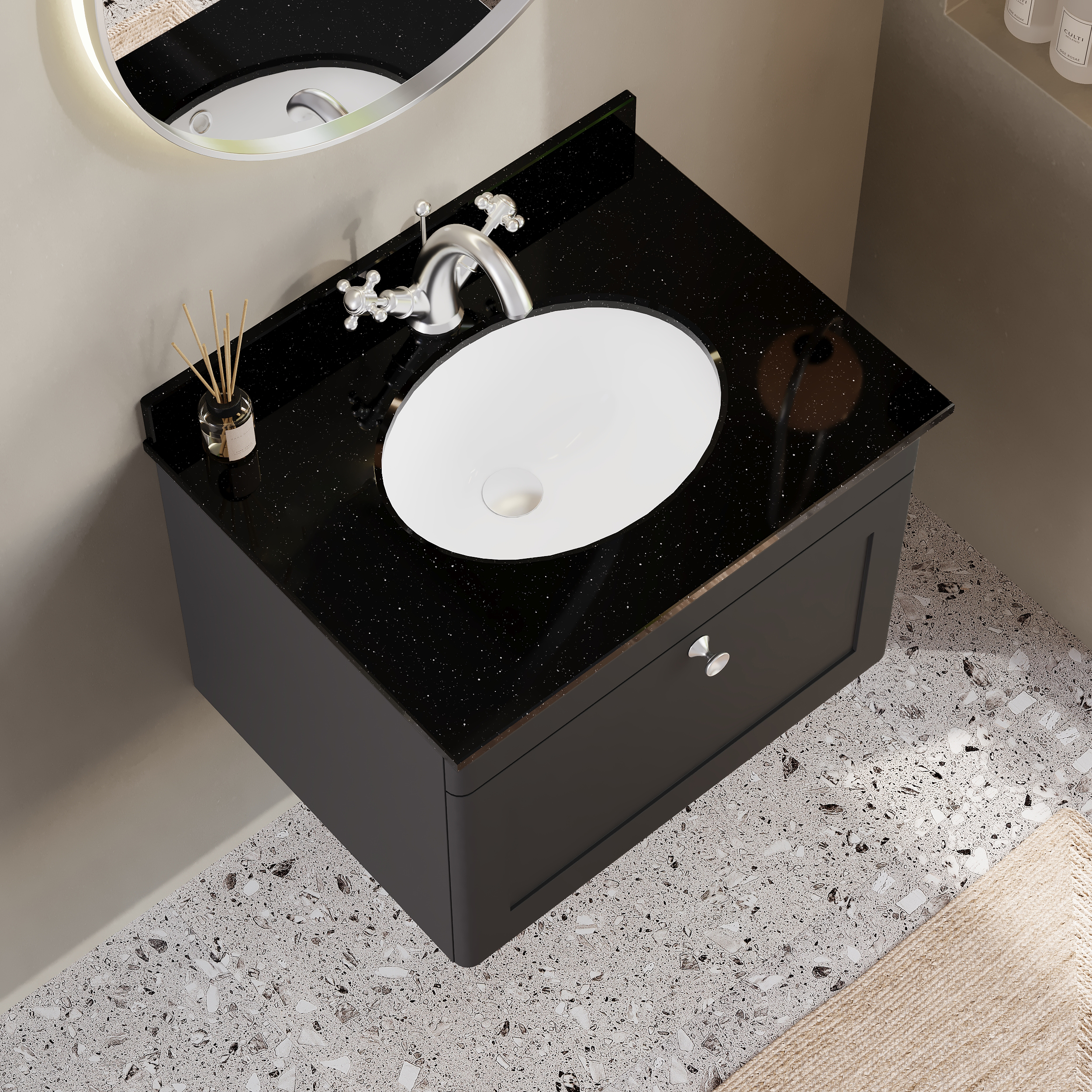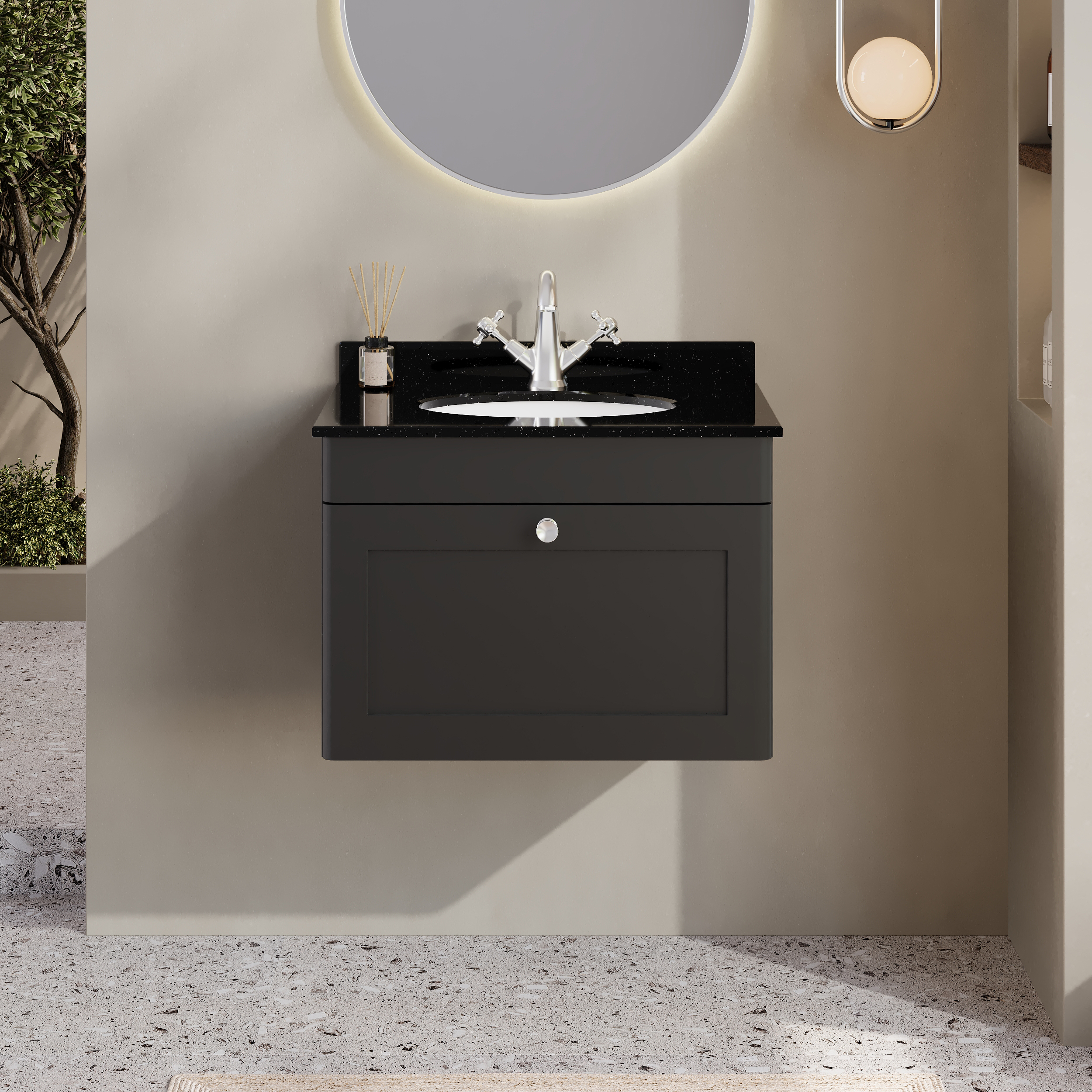 Nuie Classique 600mm Soft Black Wall Hung 1 Drawer Vanity Unit with 1 Tap Hole Basin