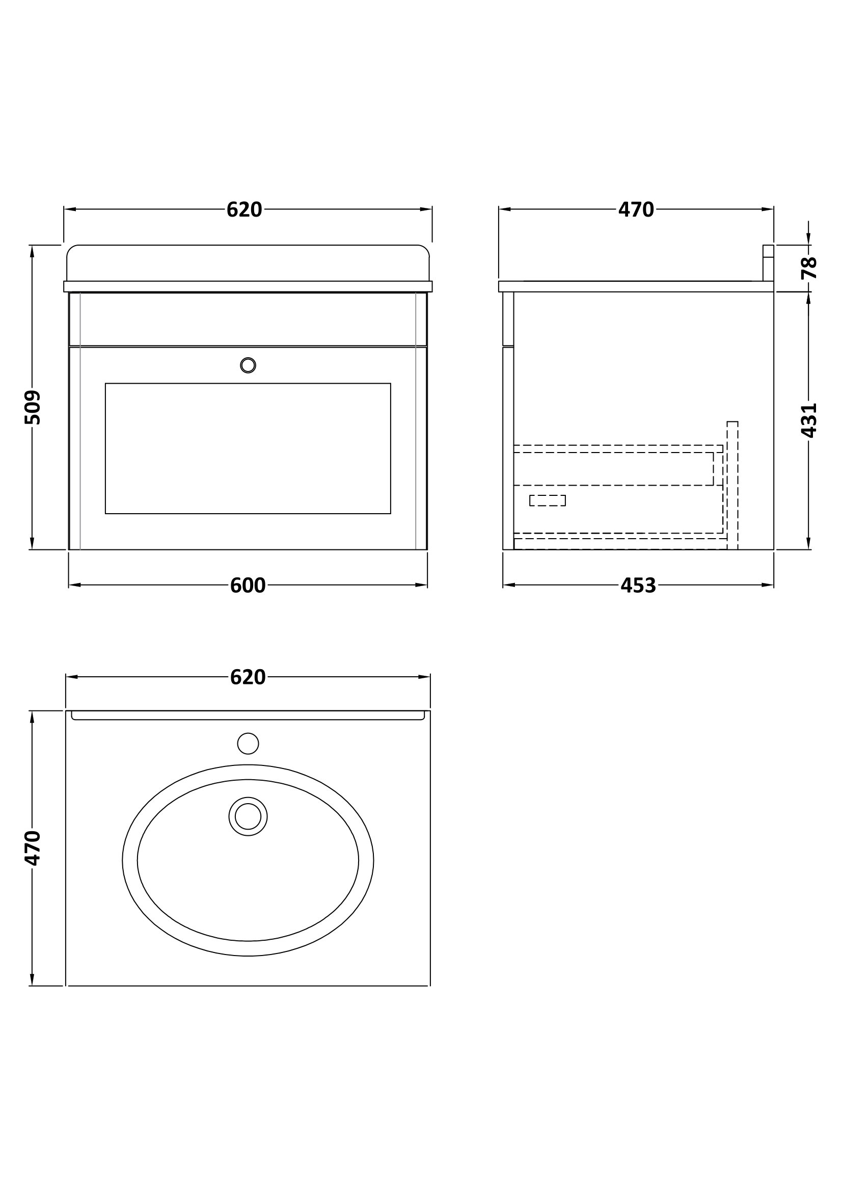 Nuie Classique 600mm Soft Black Wall Hung 1 Drawer Vanity Unit With 1 Tap Hole Round Basin