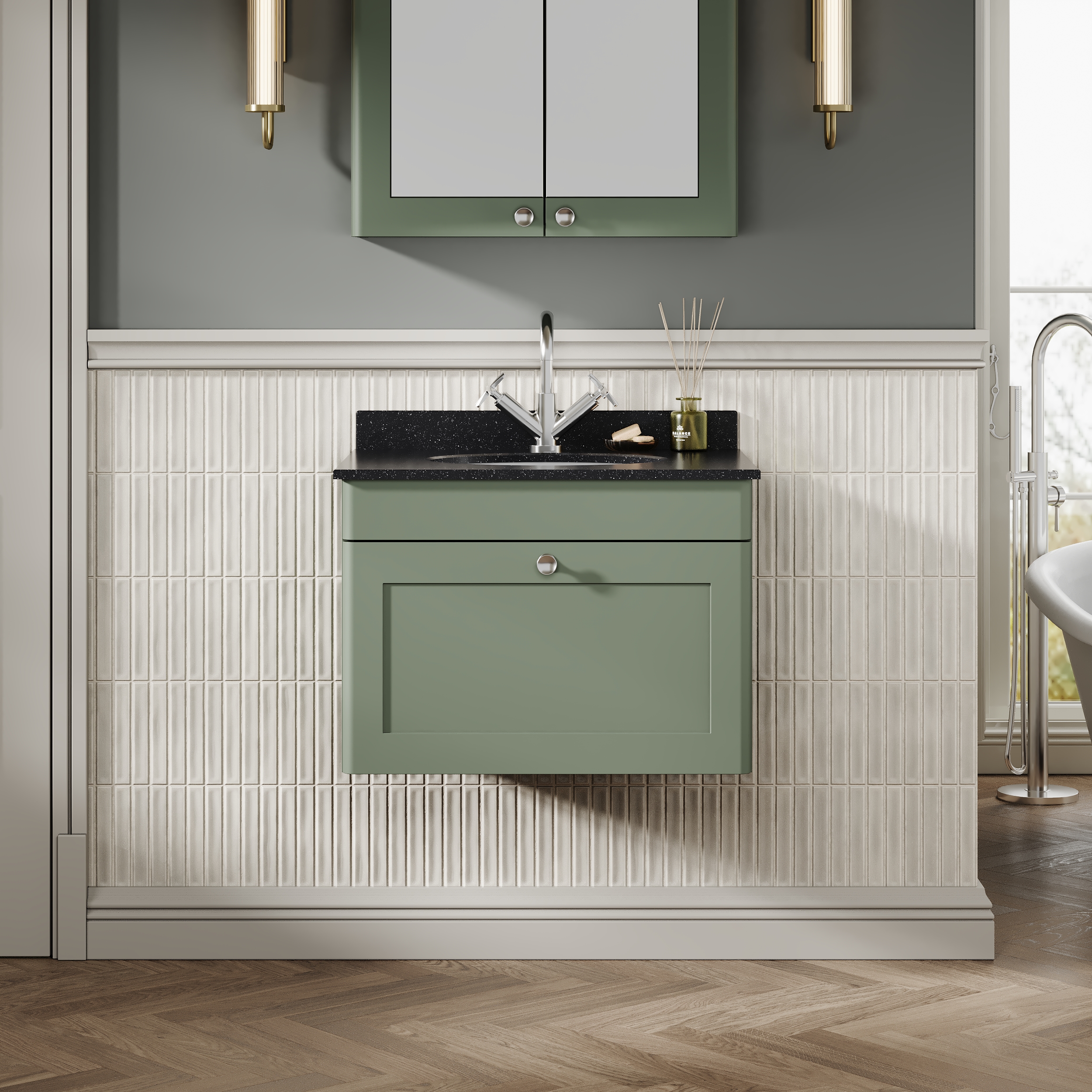 nuie Classique Wall Hung 1 Drawer Unit & 1 Tap Hole Marble Top with Oval Basin, 600mm - Satin Green/Black