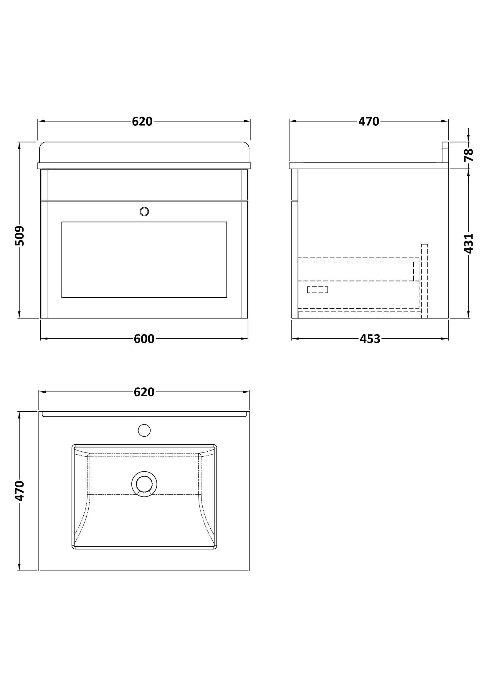 Nuie Classique 600mm Satin Green Wall Hung 1 Drawer Vanity Unit With 1 Tap Hole Basin & Soft Close