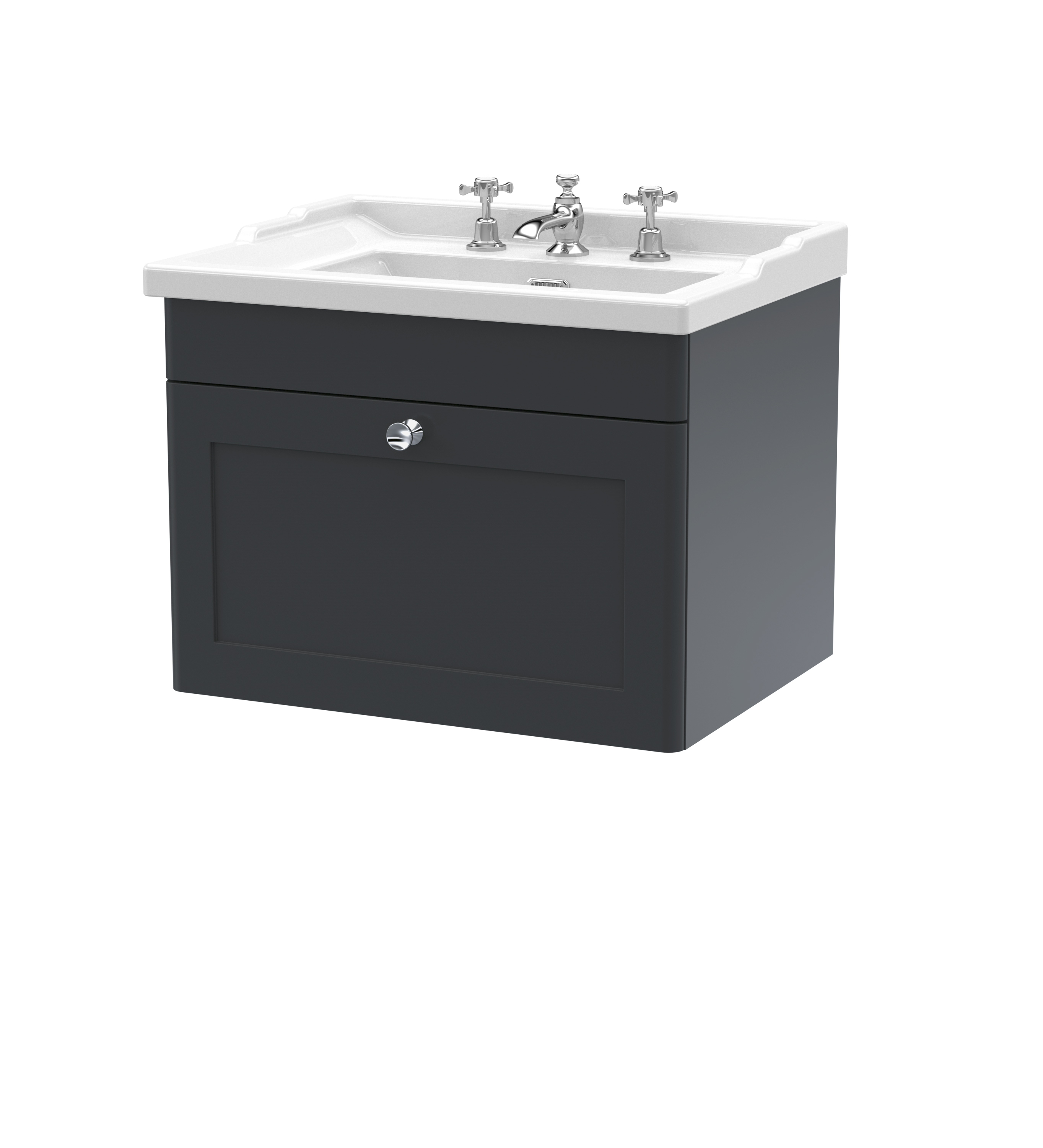 Nuie Classique 600mm Soft Black Wall Hung 1 Drawer Vanity Unit with 1 Tap Hole Basin