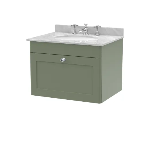 nuie Classique Wall Hung 1 Drawer Unit & 3 Tap Hole Marble Top with Oval Basin, 600mm - Satin Green/Grey