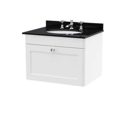 Nuie Classique 600mm Satin White Wall Hung 1 Drawer Vanity Unit With 3 Tap Hole Basin