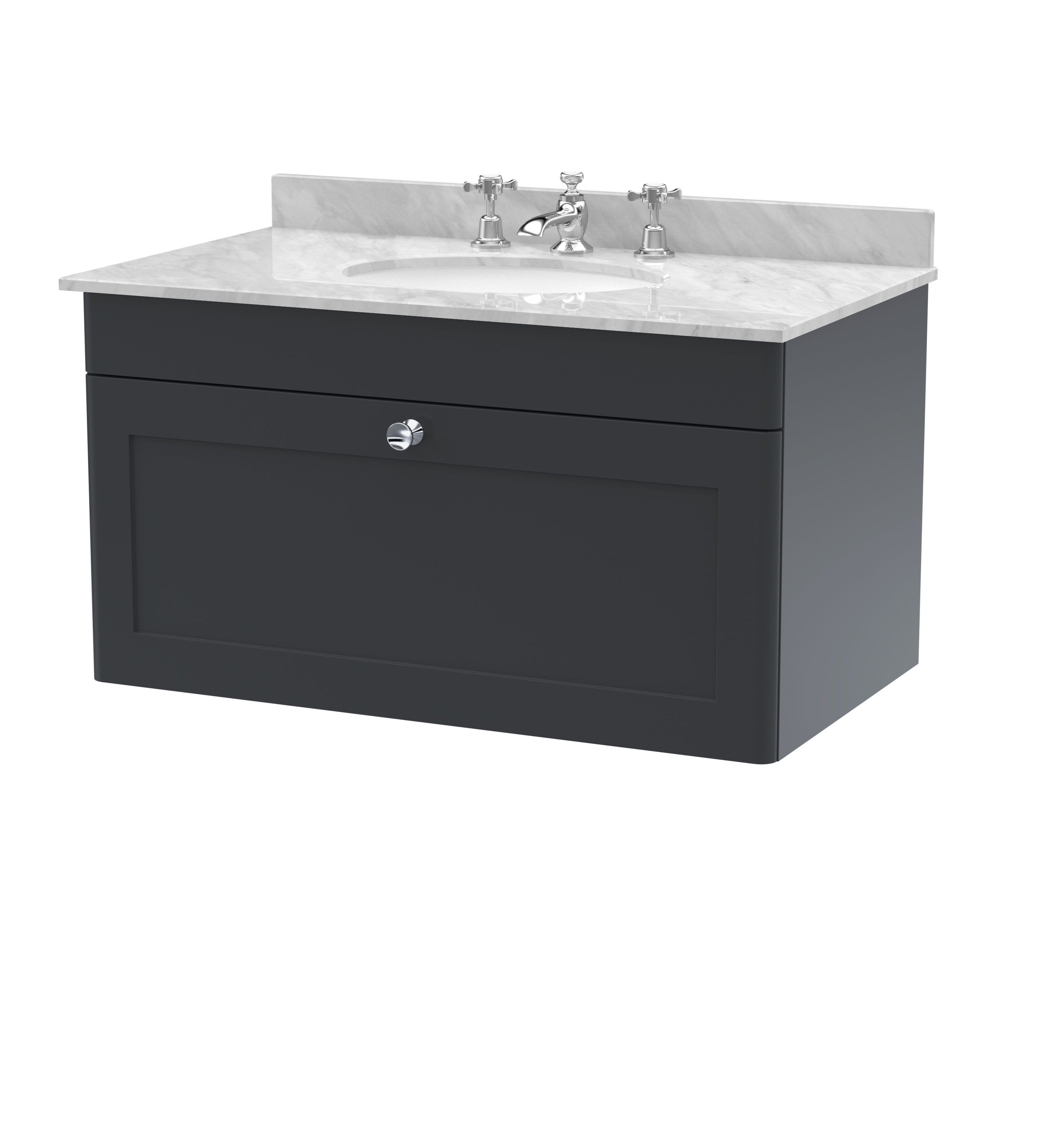 Nuie Classique 830mm Soft Black Wall Hung 1 Drawer Vanity Unit With 3 Tap Hole Basin